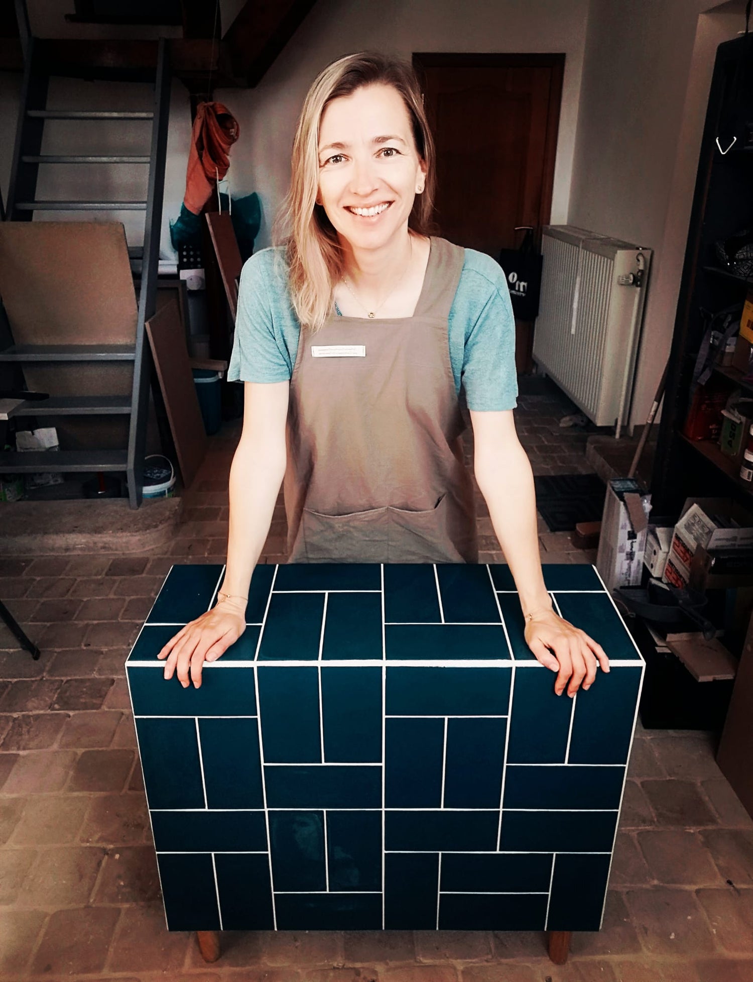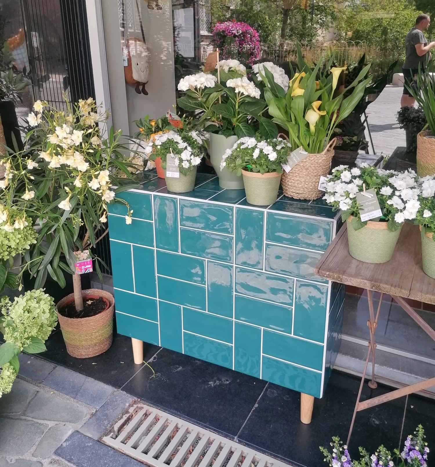 La hauteur de la commode a été diminuée afin de rendre plus visible les magnifiques fleurs de la boutique. Les carreaux sont brillants, lumineux et tout en relief.