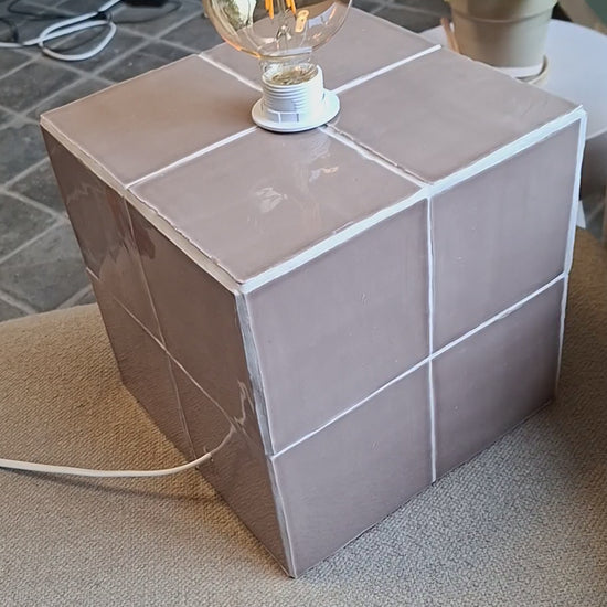 La lampe est composée de carreaux de 13*13cm de couleur taupe. Un abat-jour peut être ajouté par vos soins. La lampe est vendue sans l’ampoule.