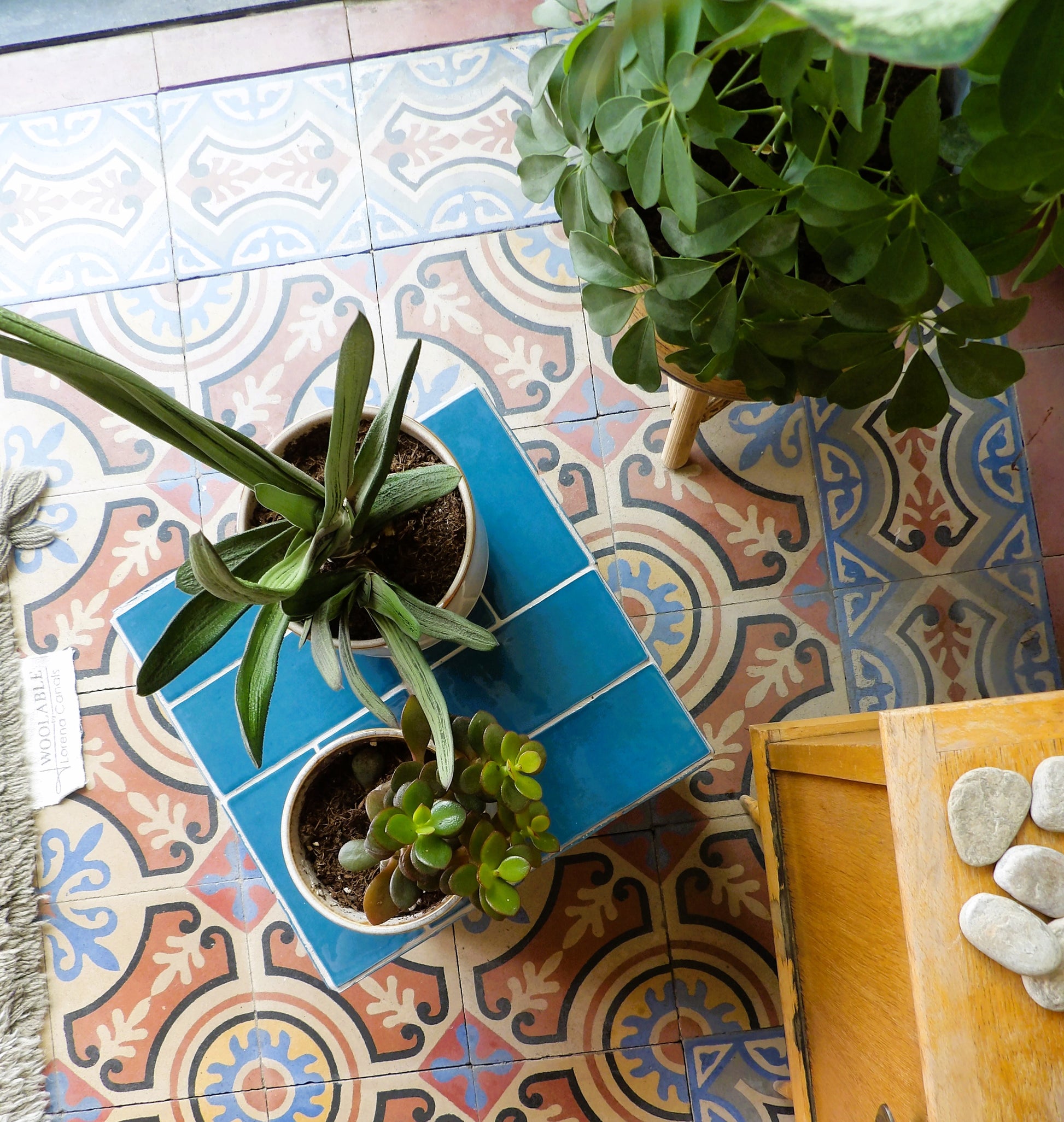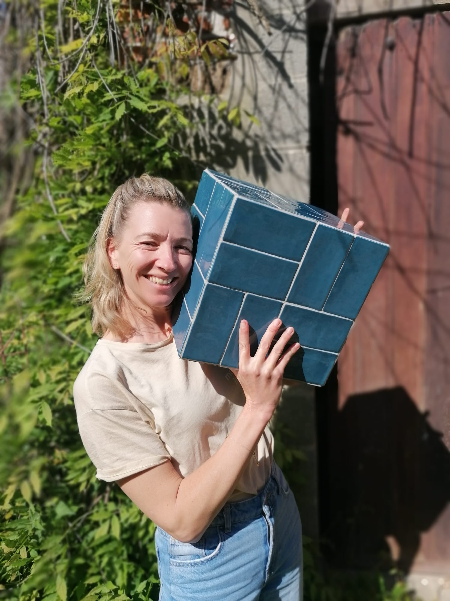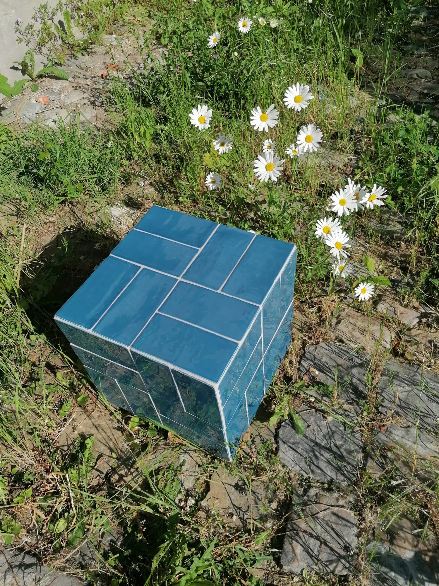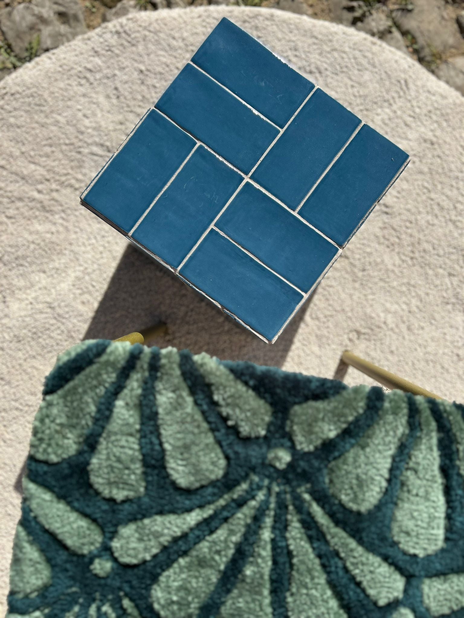 Une jolie table d'appoint lumineuse. Ses reflets sont changeant selon la luminosité de par la texture des carreaux.