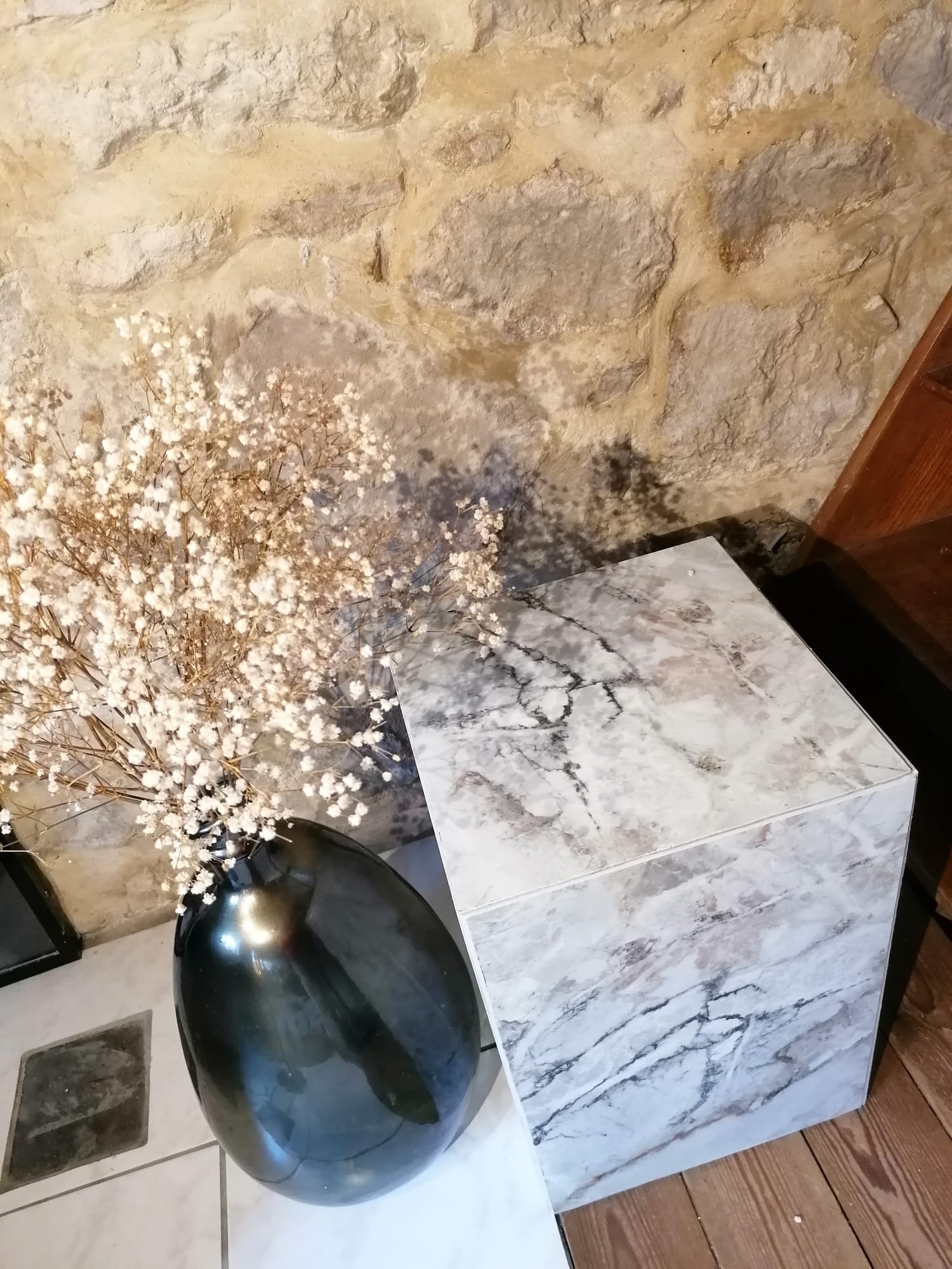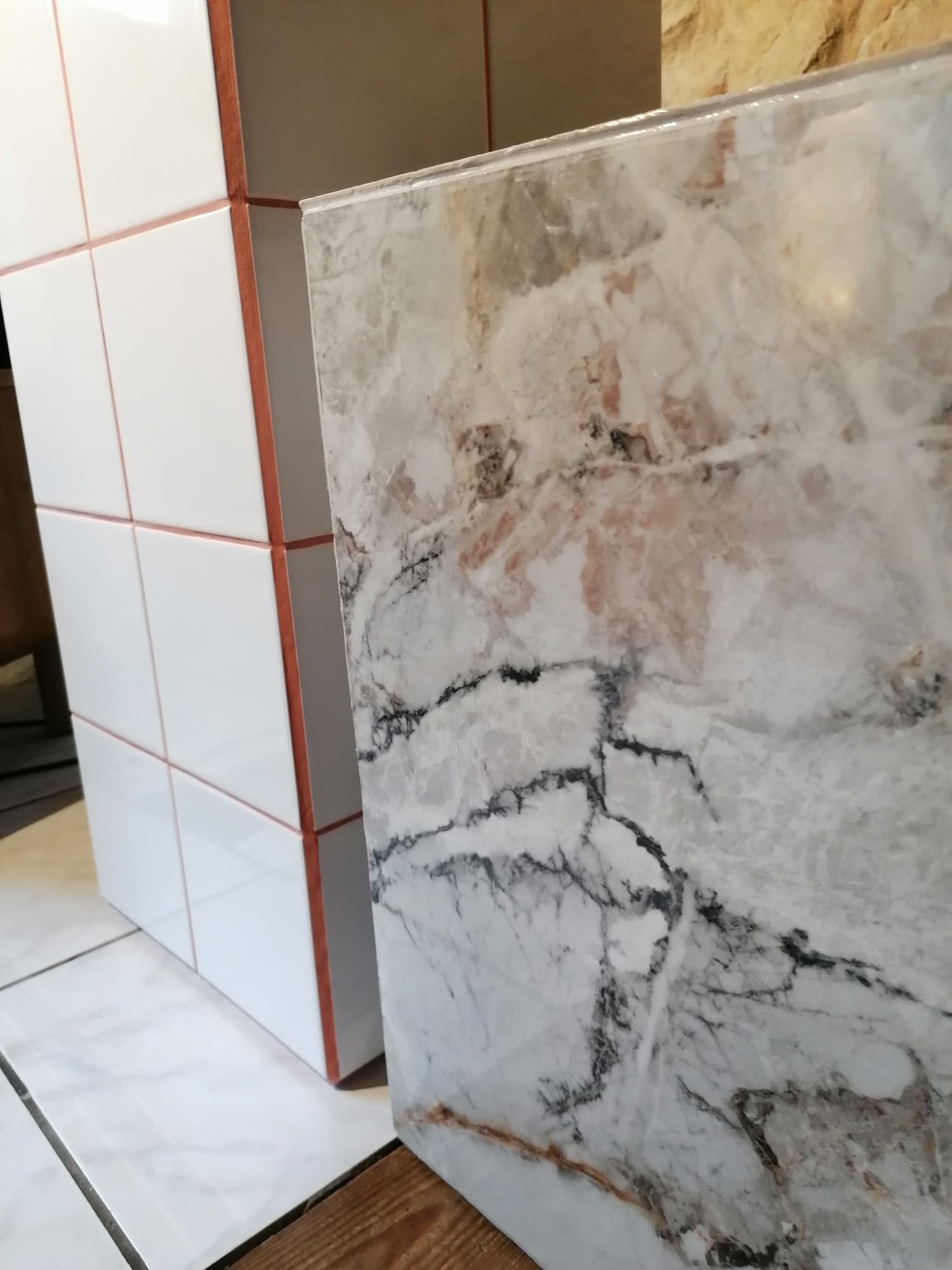 Une box composée de grès cérame imitation marbre, finition brillante.