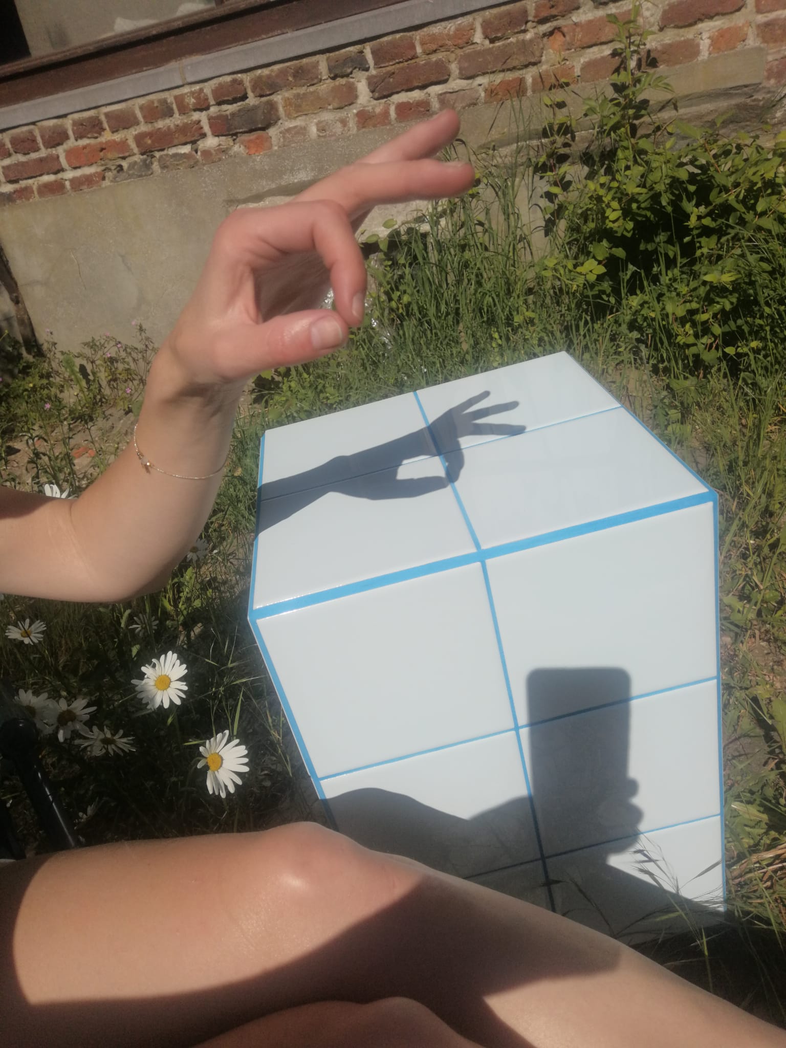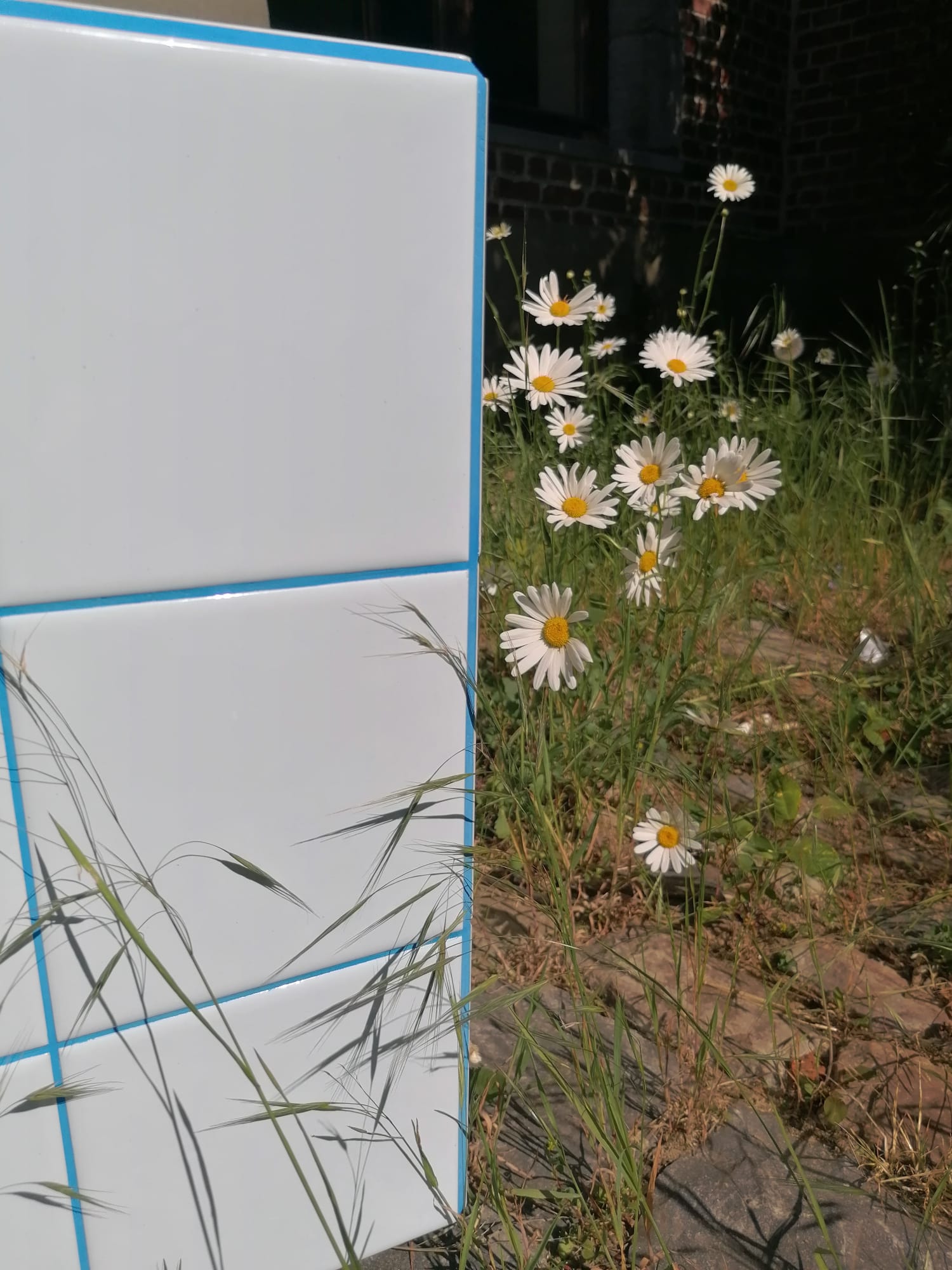 La Rétro Box est composée de carreaux bleu pâle et de joints bleu turquoise.