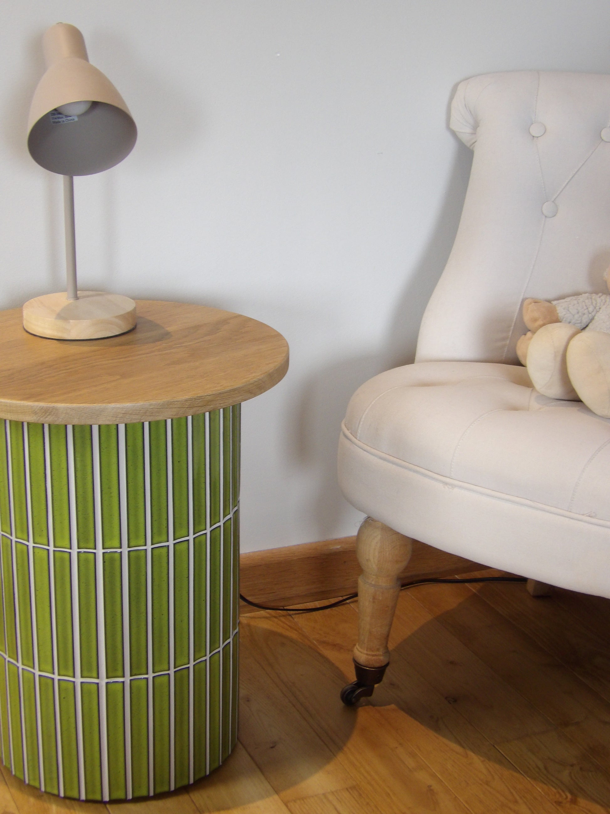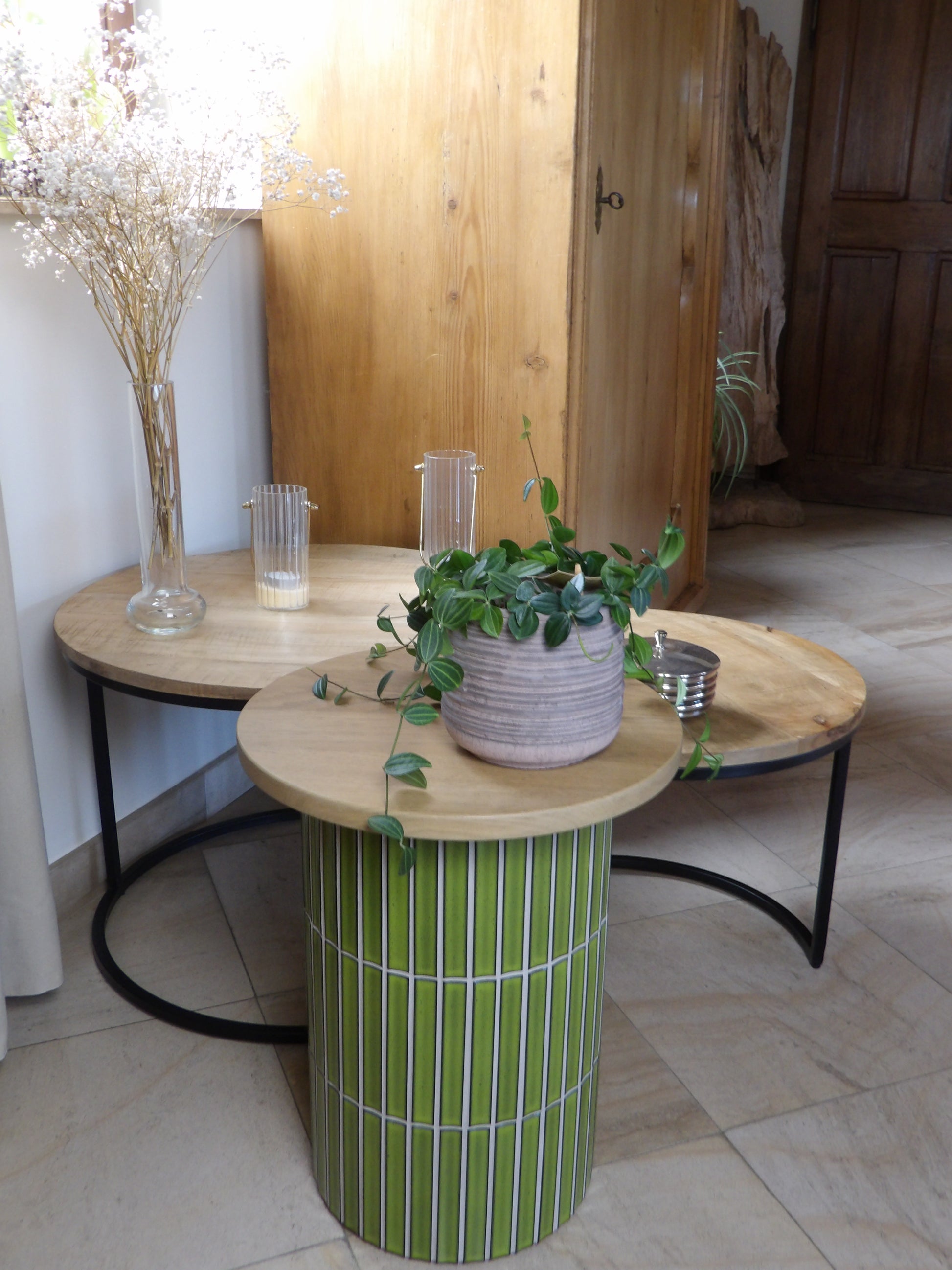 La table ronde d'appoint est composée d'un pied cylindrique complètement carrelé et son plateau en chêne.